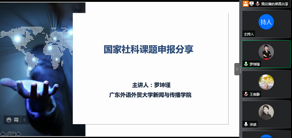 会议开始,罗坤瑾教授结合自身成功申报国社科项目以及参与评审工作的经验进行了国家社科课题申报分享。她从国家社科课题申报的“四度”(专业度、专注度、时度、效度)标准展开,对项目申报各个环节作全面阐述。她着重分析了如何选题和如何论证两个重要问题。在选题上,罗教授提出选题要符合专业范围、紧盯学术热点,瞄准国家急需、迫切解决的重大现实问题;在论证上,罗教授对如何优化思路图、参考文献、前期成果等内容提出了针对性建议。