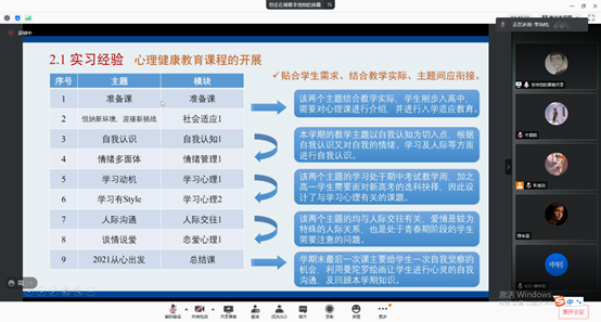 最后由学校实习组的冯君萍(广州市轻工技师学院心理学科心理辅导教师)、叶嘉恩(倍多分教育心理辅导教师)以及李浩然(东莞市第一中学心理科高中心理教师)3名同学进行了学校实习经验分享,同学们从教团队格证考取、培养多元兴趣爱好以及面试经验等方面详细介绍了学校类工作特点和面试经验。