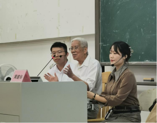 座谈会正式开始前播放了关于黄建华教授的一段短片,短片中有一段关于黄建华教授的采访。生活中的黄教授,即便是面对病痛的折磨,每日也会坚持完成《汉法大词典》的词汇更新。拥有47年党龄的黄教授,更是用自己的人生悟出了“为共产主义奋斗终身”这一句誓词其中的含义———一句誓言,一本词典,一生奋斗。“南粤楷模”黄建华教授在为我们分享他的人生故事的同时,也为在场的同学们答疑解惑。